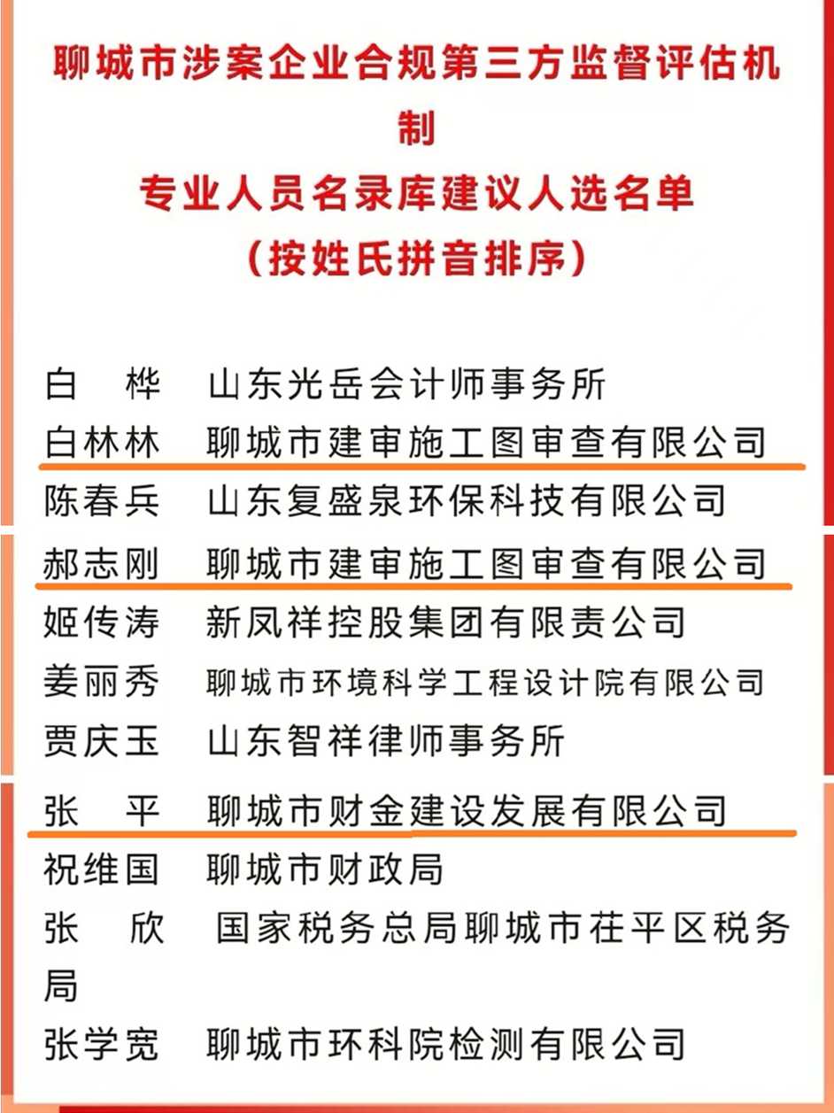 近日,聊城市涉案企業(yè)合規(guī)第三方機(jī)制管委會公示聊城市涉案企業(yè)合規(guī)第三方監(jiān)督評估機(jī)制專業(yè)人員名錄庫人員名單,我集團(tuán)審計(jì)法務(wù)部張平、圖審公司郝志剛、白林林三位同志經(jīng)公開公告、個人報(bào)名、組織推薦、管委會研究、擬入庫公示等程序,確定為聊城市涉案企業(yè)合規(guī)第三方監(jiān)督評估機(jī)制專業(yè)人員。