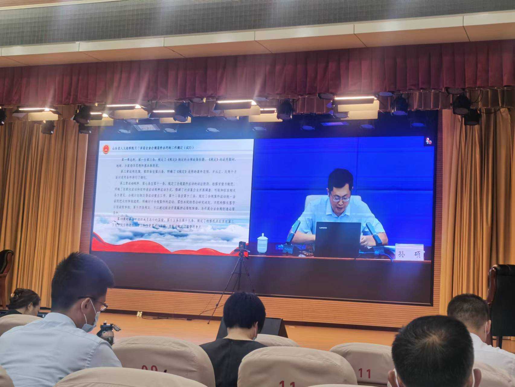 本次培訓(xùn)由山東省人民檢察院第四檢察部孫碩同志解讀《山東省人民檢察院關(guān)于涉案企業(yè)合規(guī)案件辦理的工作規(guī)定(試行)》及辦理案件有關(guān)標(biāo)準(zhǔn),強調(diào)辦理企業(yè)合規(guī)案件應(yīng)當(dāng)以習(xí)近平新時代中國特色社會主義思想為指導(dǎo),深入貫徹落實習(xí)近平法治思想,堅持講政治原則,堅持依法辦理原則,堅持審慎穩(wěn)妥原則,堅持質(zhì)量優(yōu)先原則,堅持職權(quán)法定原則,實現(xiàn)司法辦案政治效果、社會效果和法律效果的有機統(tǒng)一。