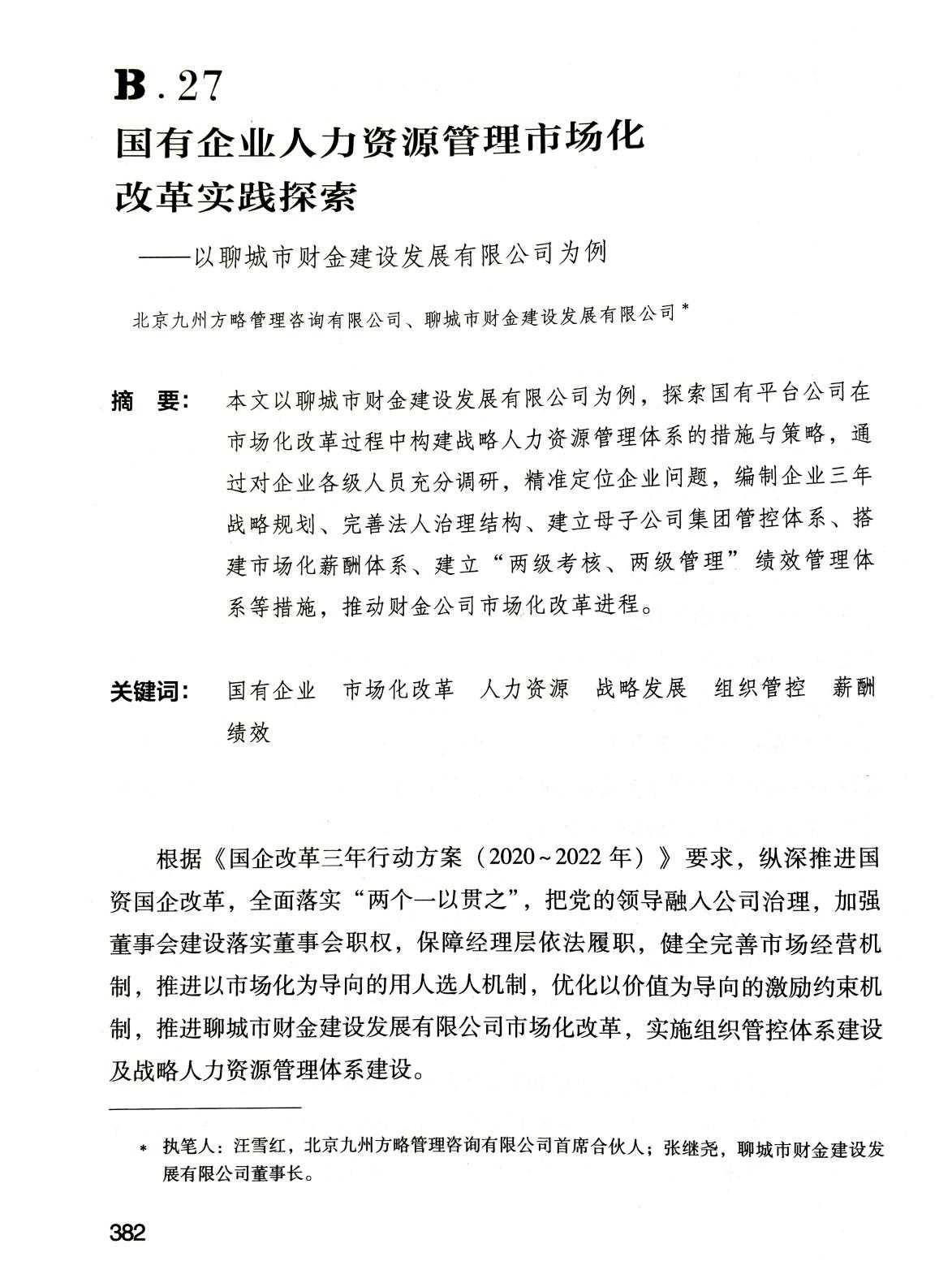 近日,中國人事科學(xué)研究院發(fā)布《中國企業(yè)人力資源發(fā)展報告(2022)》,聊城市《國有企業(yè)人力資源市場化改革實踐探索案例---以聊城市財金建設(shè)發(fā)展集團有限公司為例》入選。該報告屬于《人力資源藍皮書》系列,由中國人事科學(xué)研究院出版(隸屬于中華人民共和國人力資源和社會保障部),是我國干部人事改革、人才資源開發(fā)、人力資源管理和公共行政學(xué)研究的唯一國家級專業(yè)研究機構(gòu),是中央人才工作協(xié)調(diào)小組辦公室命名的“人才理論研究基地”。此報告為年度出版,匯集了央企和地方國企、知名民營企業(yè)和外資企業(yè)在人力資源開發(fā)與管理、人事制度改革創(chuàng)新等方面的實踐探索,為我國企業(yè)人力資源開發(fā)和管理工作提供了借鑒,為政府政策的制定提供了參考。2022年度中國人力資源發(fā)展報告共入選7篇案例,除市財金集團為地市級國有企業(yè)外,其余均為軍工、能源、運輸類央企。